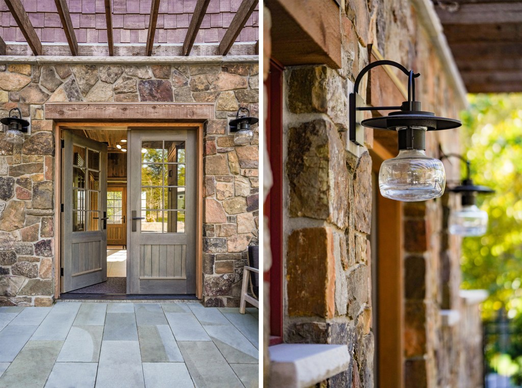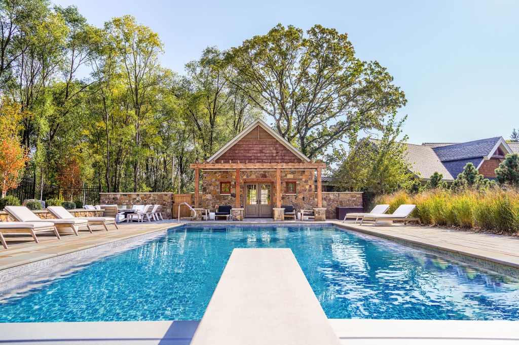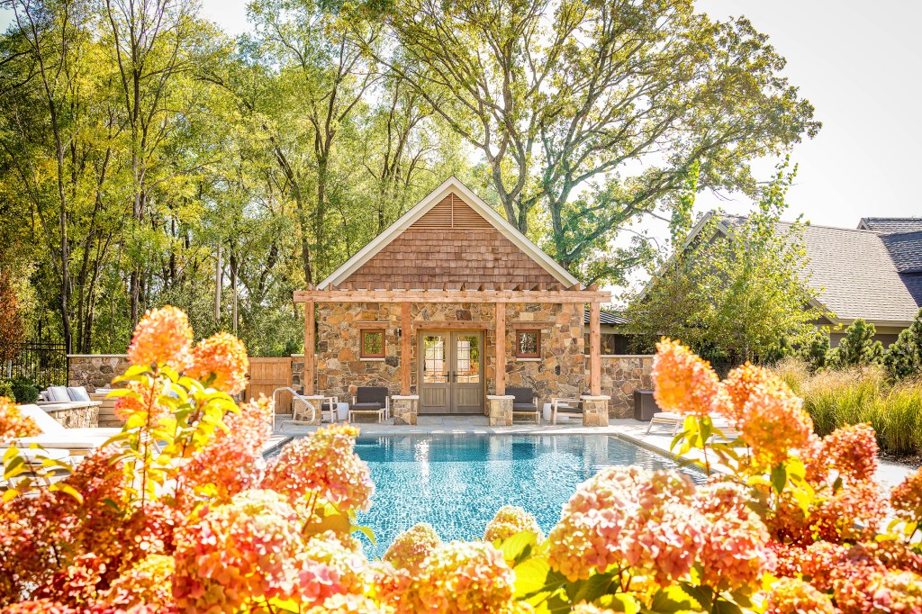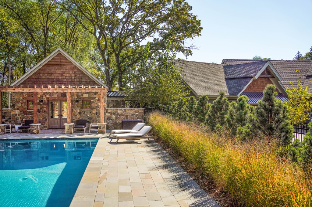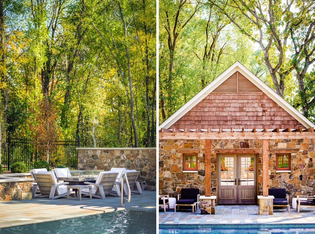 The design team created sophisticated yet casual spaces both inside and outside the Pool House. The use of a natural material palette of stone and wood on the exterior help create a calm oasis and tie the new spaces into the surrounding wooded lot.