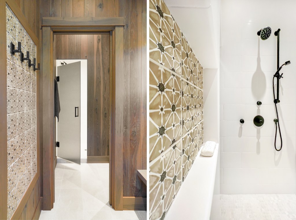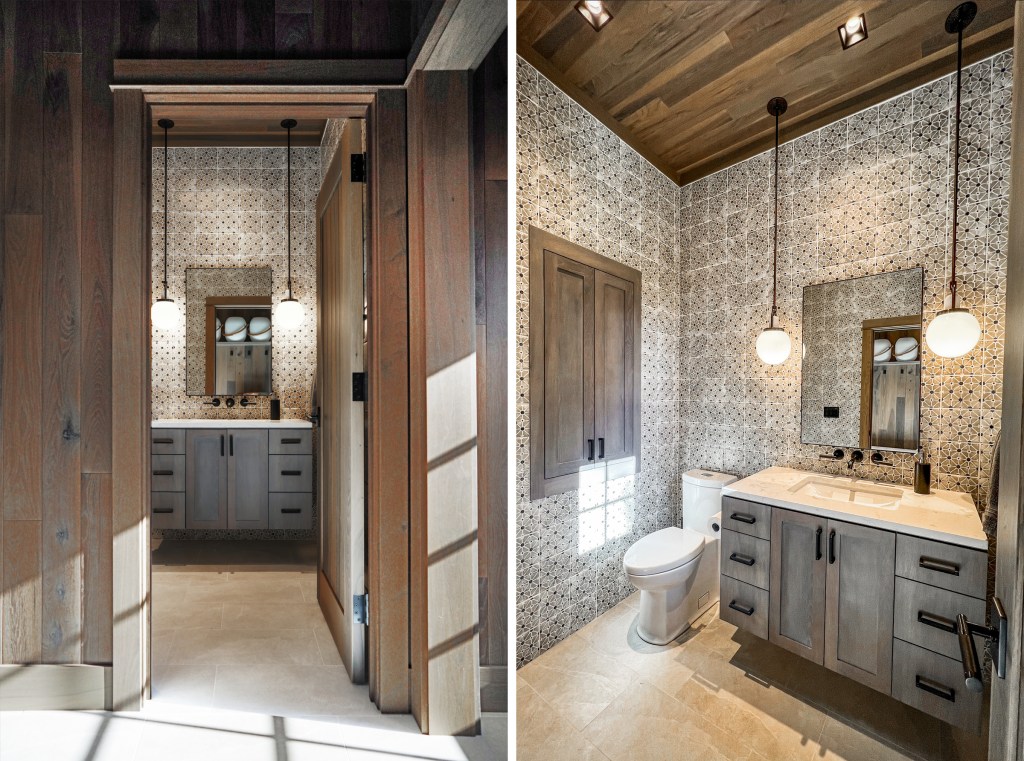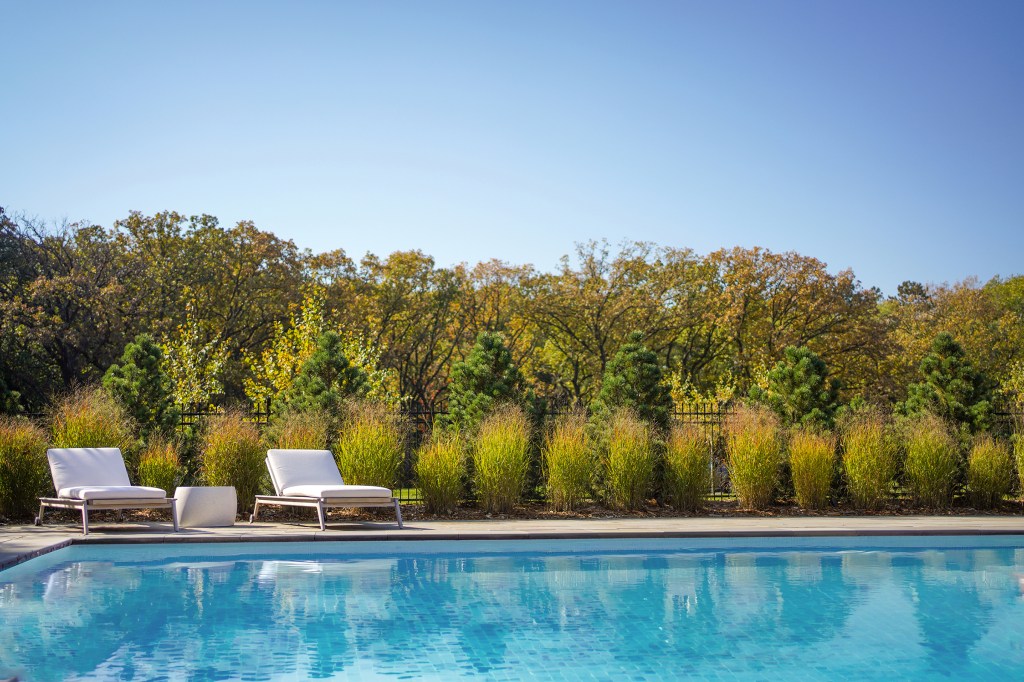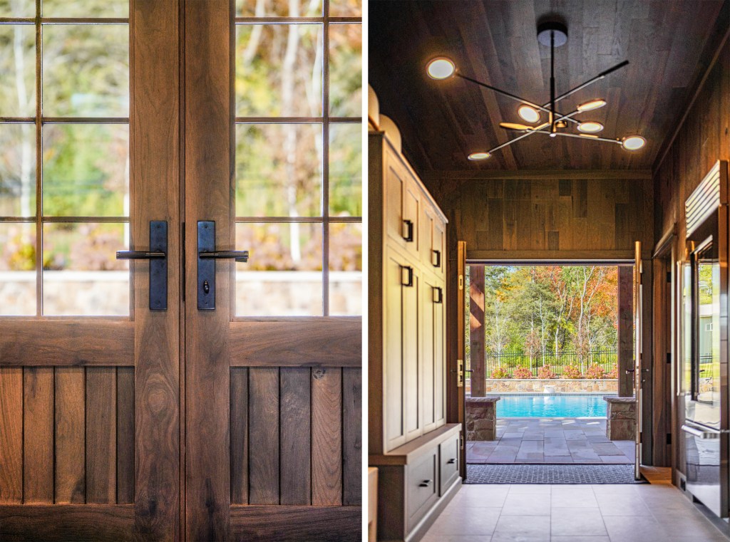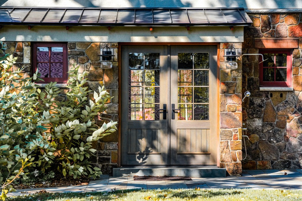 The design team created sophisticated yet casual spaces both inside and outside the Pool House. The use of a natural material palette of stone and wood on the exterior help create a calm oasis and tie the new spaces into the surrounding wooded lot.