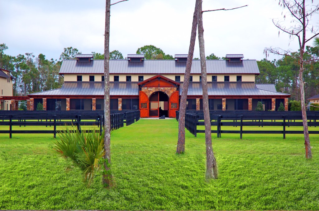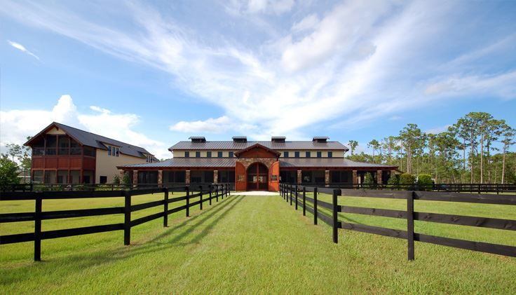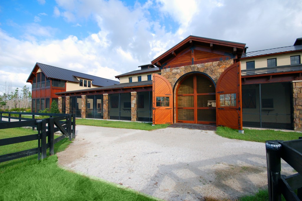 A California/mountain style is adapted to suit south Florida in the manner of Bernard Maybeck for this equestrian compound. The project includes a barn, groom’s quarters and equipment buildings in addition to a main residence for the client. The buildings feature natural stone, stucco, and heavy timbers to give the compound a western ambiance without being out of place in Mediterranean dominated Florida.