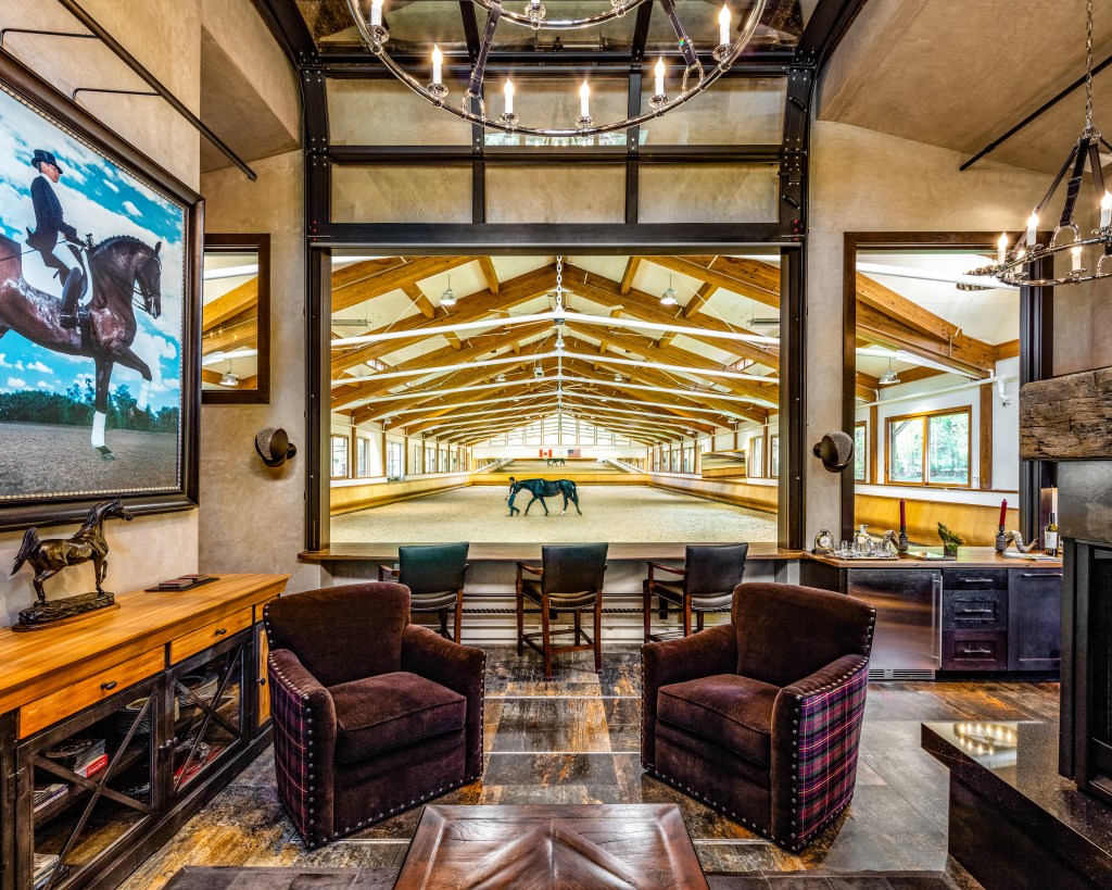 This custom timber-framed barn complex in Snowmass, CO includes a regulation sized dressage ring , attached indoor hot walker and lungeing ring. The viewing room adjacent to the ring features a fireplace, bar, and an overhead door that allows it to open up to the arena. This private barn also includes 8 stalls, a wash stall, grooming stall, tack room, feed room, laundry and groom’s quarters above.