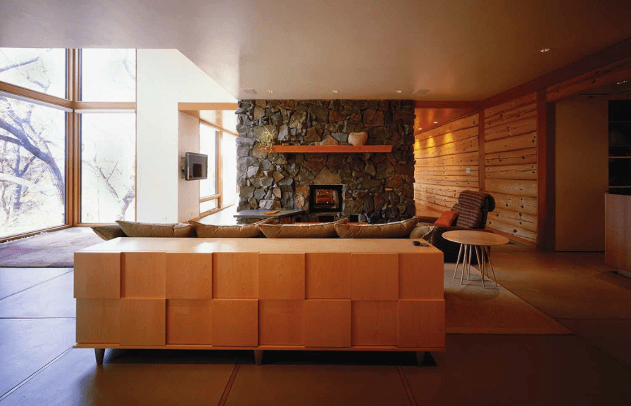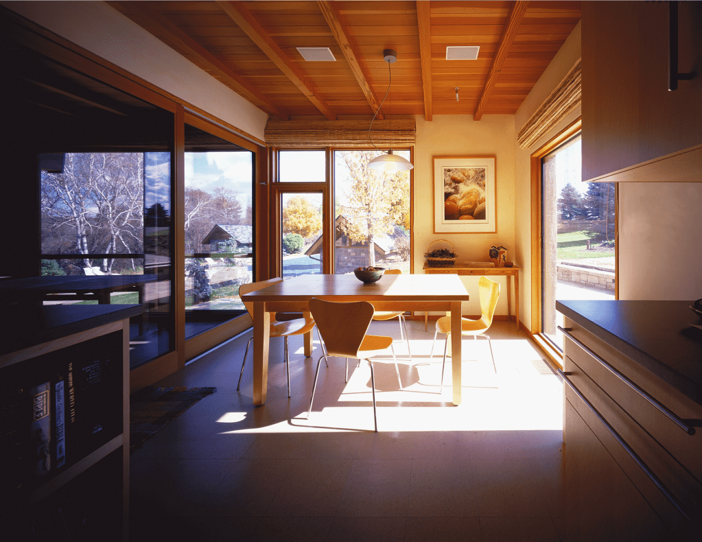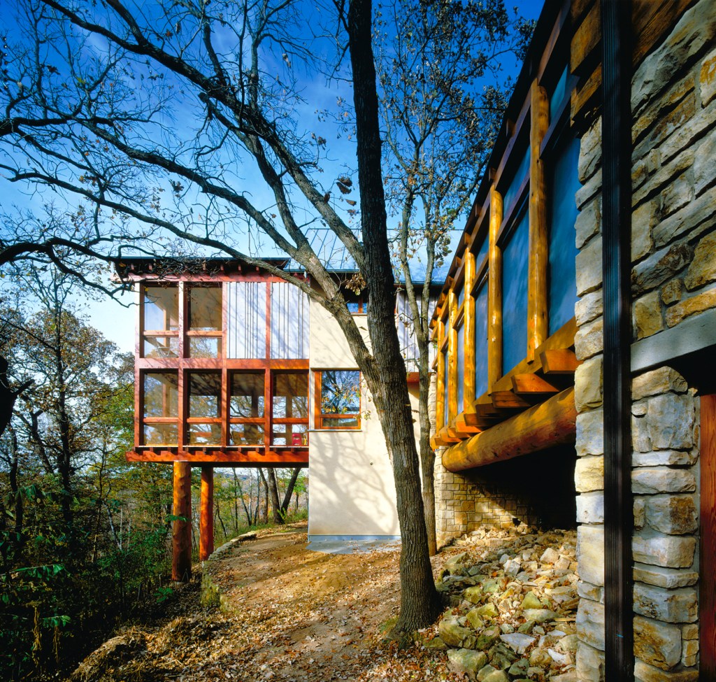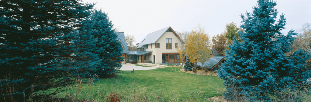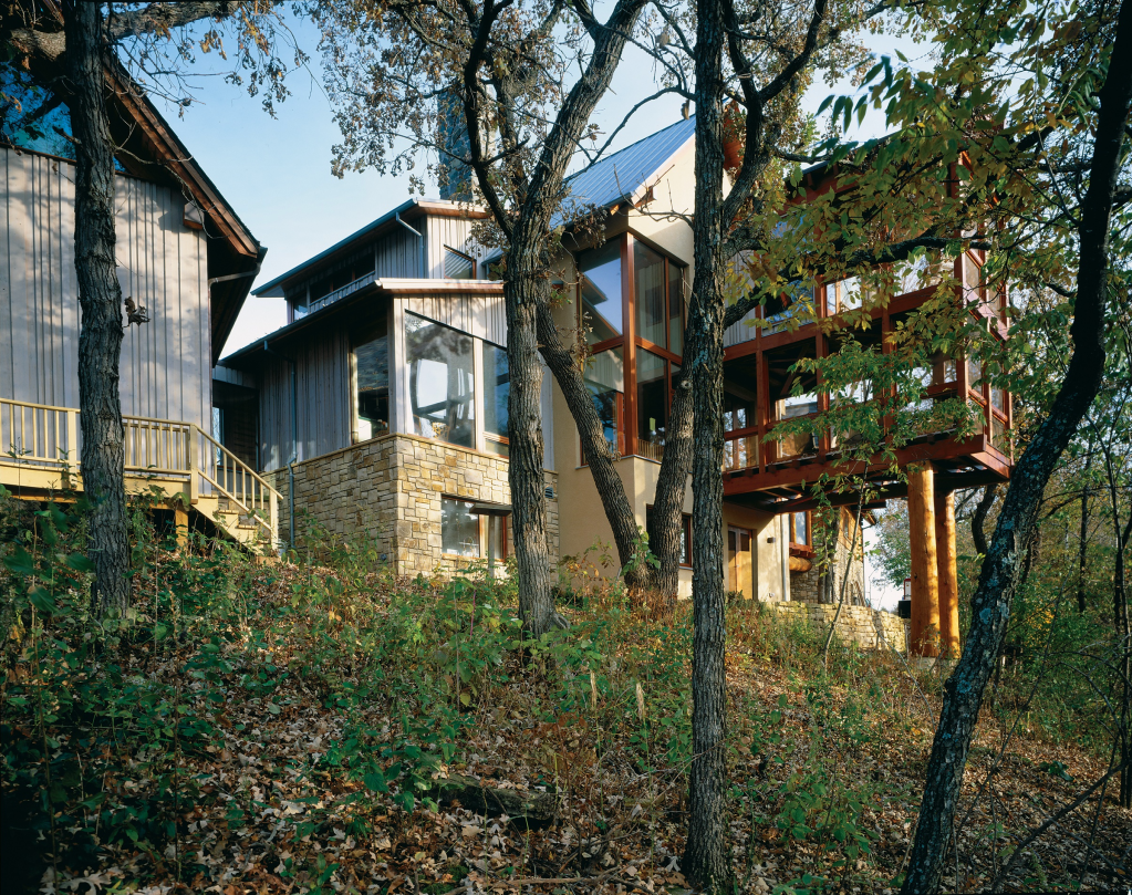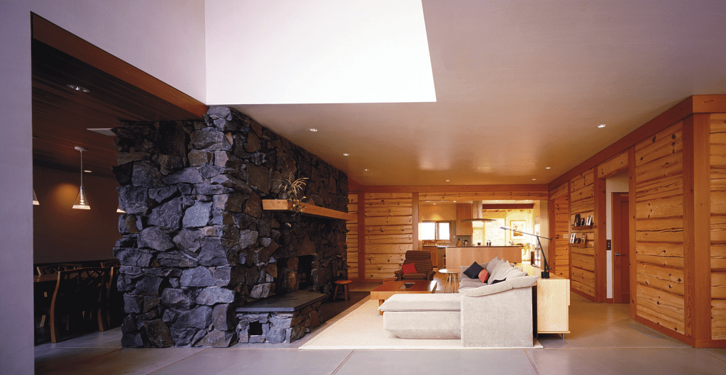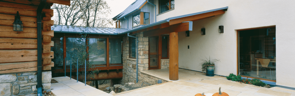 This residence is a sensitive addition to an existing rural log compound. A new, more modern interpretation of the style of the existing flanking log home and log garage was used for the structure that links them, which contains the core elements of the compound – kitchen, dining, living, and family bedrooms upstairs. Energy efficiency, recycled green materials and sustainability drove decisions on this project. Reclaimed timber framing, intricate log joinery and local limestone are used to form a core element counterpoint to more modern materials and expressions.