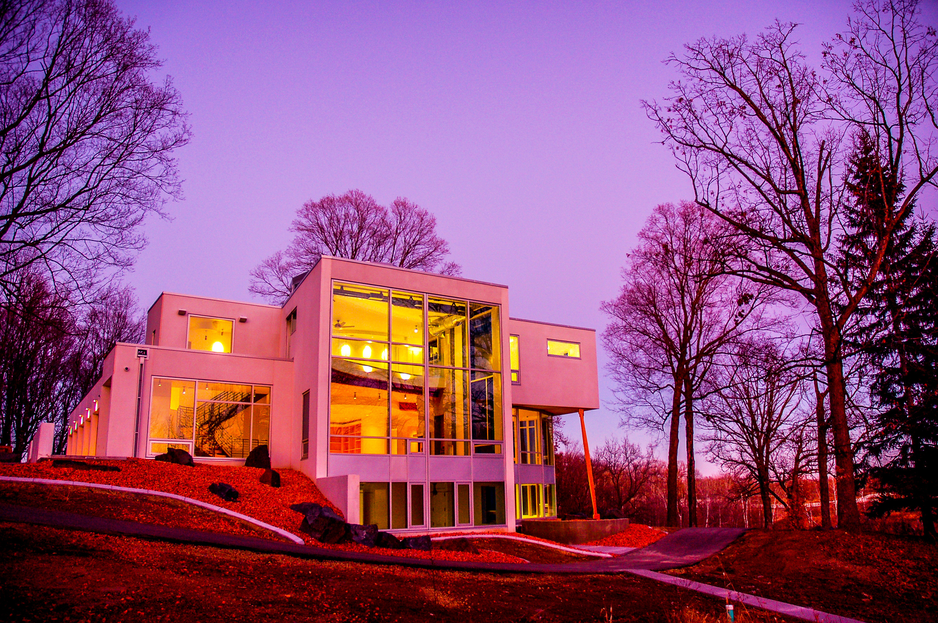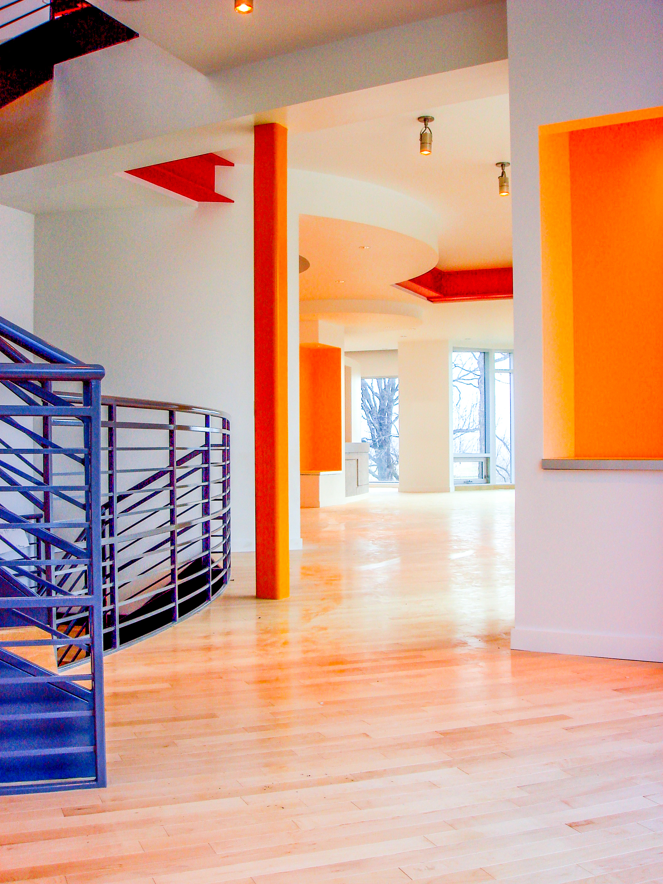 In this residence for an eye surgeon, International Style Modernism is adapted to express the mechanisms and anatomy of the human eye. The style also accommodates the methodology of the construction techniques and energy saving strategies employed. A 4-story oculus centers the plan and brings light to the core of the home. Light regulating devices from moveable screens to carefully framed views of the landscape refer light and activities to the ocular core. The home is constructed entirely of super-insulated precast concrete planks and panels on a recycled steel framework. It also features geothermal heating and cooling and high-efficiency glass.